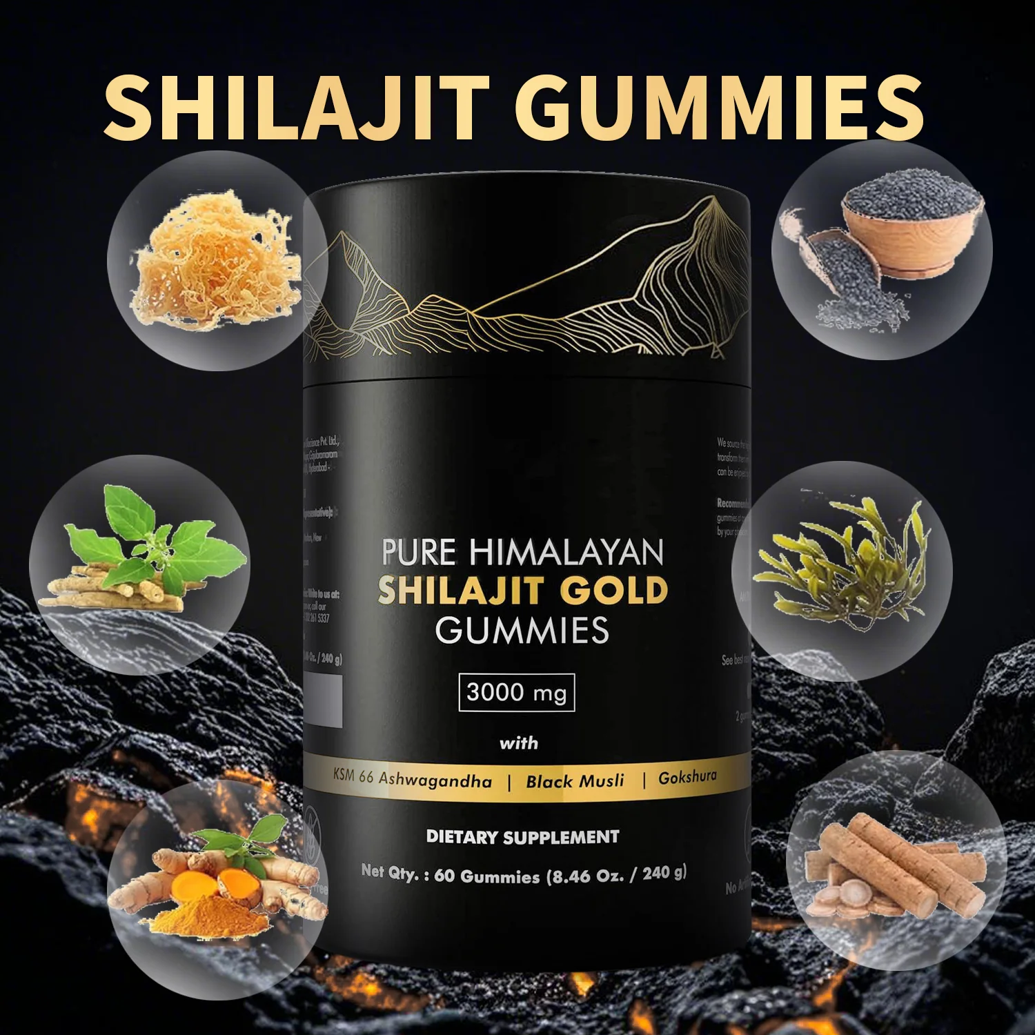 Les gommes de Shilajit Pur Himalayan Gold Grade sont récoltées dans les montagnes de l'Himalaya à une altitude de 18,000 pieds et sont pures et non altérées. Les gommes de Shilajit sont destinées à ceux d'entre vous qui poursuivent un mode de vie sain. Elles sont conçues pour stimuler l'énergie et vous aider à faire de l'exercice et à récupérer.
